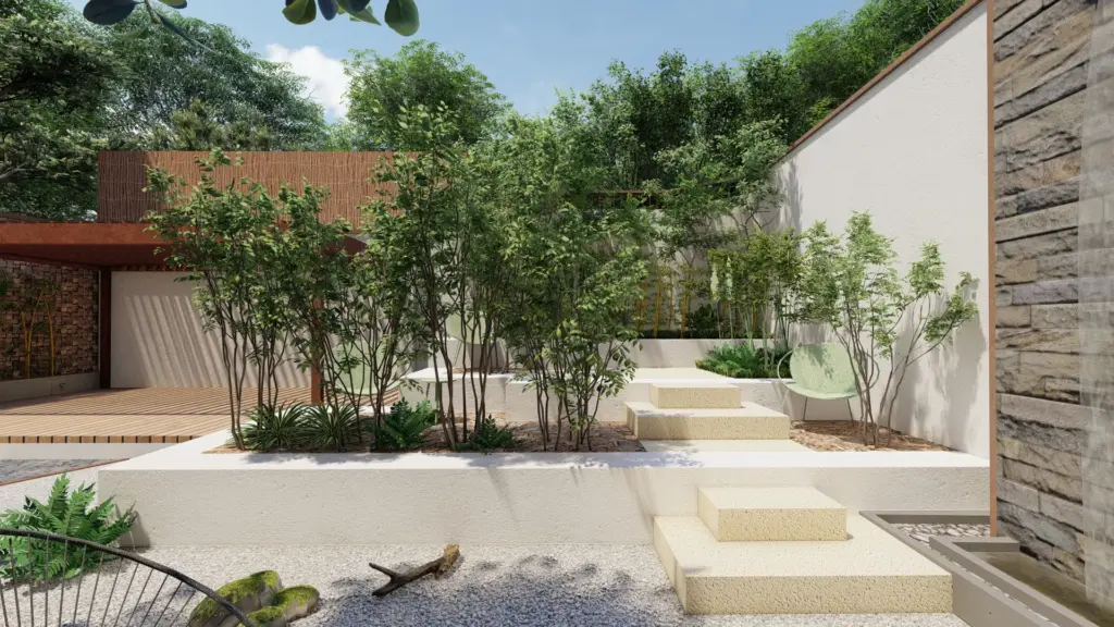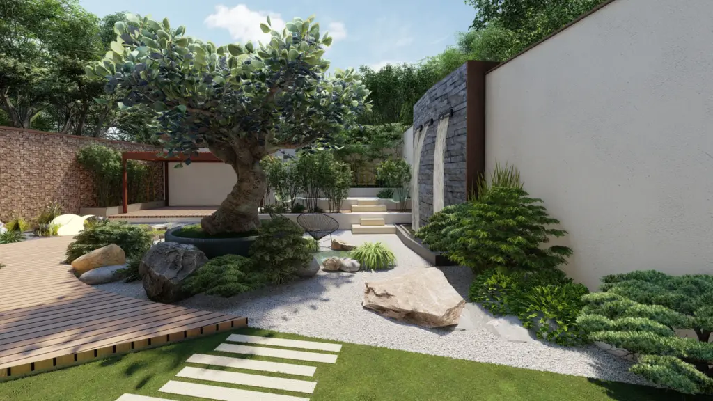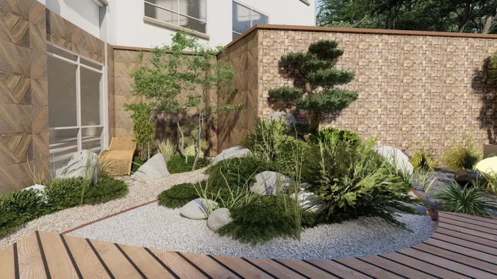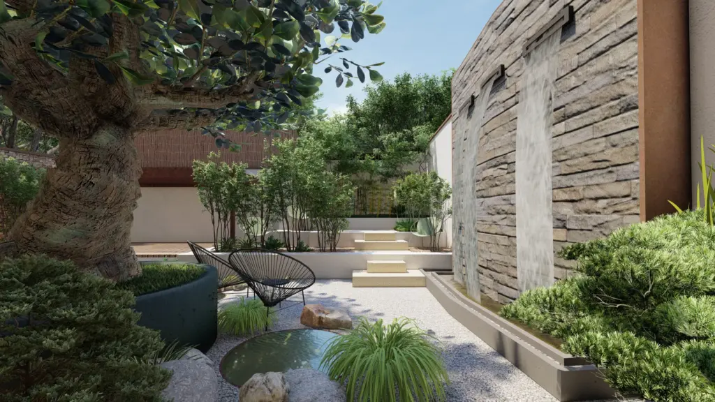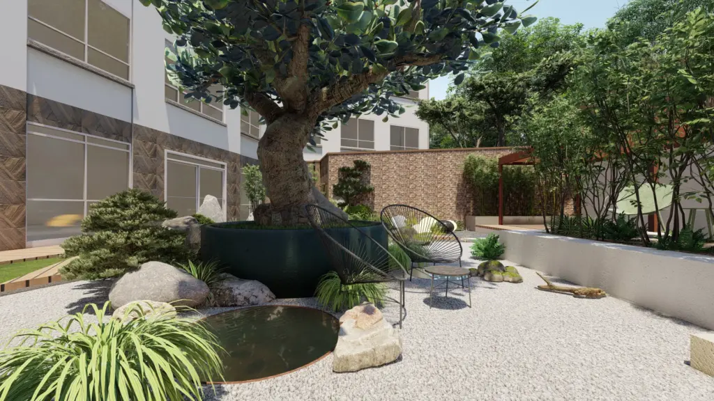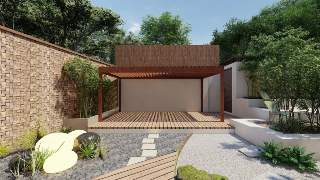 Este proxecto único integra varias zonas coidadosamente deseñadas para crear un ambiente de paz e beleza. Desfruta de un xardín zen, un muro chorón, espellos de auga, sendeiros serenos, unha pérgola bioclimática e espazos de descanso idílicos. Cada área foi meticulosamente planificada para ofrecer un refuxio relaxante e visualmente impactante.